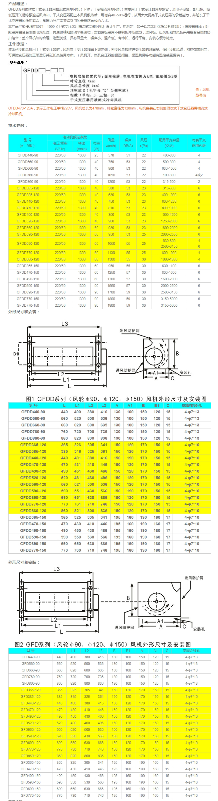 產(chǎn)品概述: GFDD系列頂吹式干式變壓器用橫流式冷卻風(fēng)機(jī)(下稱:干變橫流冷卻風(fēng)機(jī))主要用于干式變壓器冷卻增容,及電子設(shè)備、配電柜、高低壓開關(guān)柜等強(qiáng)迫送風(fēng)冷卻。干式變壓器配上本風(fēng)機(jī)散熱后,可增容40~50%運(yùn)行,從而大大提高干式變壓器的承載能力,并延長了干式變壓器的使用壽命,是國內(nèi)外廠家普遍采用的最經(jīng)濟(jì)有效的方式。 本產(chǎn)品嚴(yán)格按JB/T8971-1999《干式變壓器用橫流式冷卻風(fēng)機(jī)》設(shè)計(jì)生產(chǎn)。電機(jī)定、轉(zhuǎn)子鐵芯采用優(yōu)質(zhì)冷軋硅鋼片;低噪音軸承;葉輪采用鋁合金表面電泳處理,再通過精細(xì)的動(dòng)平衡調(diào)校;左右端板采用不銹鋼板沖壓成型,進(jìn)風(fēng)板、出風(fēng)板和導(dǎo)風(fēng)板采用鋁合金型材搭扣組合;整個(gè)風(fēng)機(jī)結(jié)構(gòu)合理,造型美觀,具有風(fēng)量大、噪聲小、溫升低、壽命長、運(yùn)行平穩(wěn)、安裝方便等特點(diǎn)。 工作原理: 該系列冷卻風(fēng)機(jī)用于干式變壓器時(shí),風(fēng)機(jī)置于變壓器線圈下部兩側(cè),將冷風(fēng)直接吹進(jìn)變壓器的線圈高、低壓冷卻風(fēng)道,散熱效果明顯,可保障變壓器的正常運(yùn)行并延長其使用壽命。(風(fēng)機(jī)開、停及變壓器的超溫報(bào)警、超溫跳閘等功能有溫控裝置提供)。 |