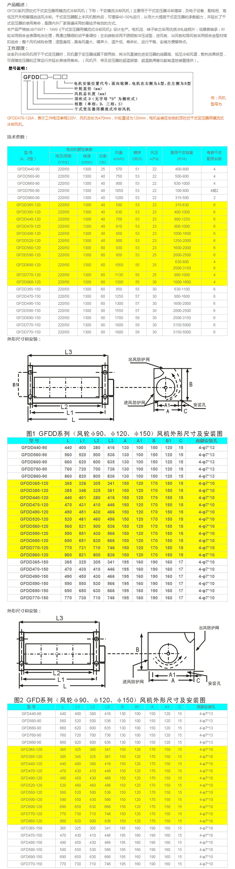 產(chǎn)品概述: GFDD系列頂吹式干式變壓器用橫流式冷卻風(fēng)機(jī)(下稱:干變橫流冷卻風(fēng)機(jī))主要用于干式變壓器冷卻增容,及電子設(shè)備、配電柜、高低壓開關(guān)柜等強(qiáng)迫送風(fēng)冷卻。干式變壓器配上本風(fēng)機(jī)散熱后,可增容40~50%運(yùn)行,從而大大提高干式變壓器的承載能力,并延長了干式變壓器的使用壽命,是國內(nèi)外廠家普遍采用的最經(jīng)濟(jì)有效的方式。 本產(chǎn)品嚴(yán)格按JB/T8971-1999《干式變壓器用橫流式冷卻風(fēng)機(jī)》設(shè)計(jì)生產(chǎn)。電機(jī)定、轉(zhuǎn)子鐵芯采用優(yōu)質(zhì)冷軋硅鋼片;低噪音軸承;葉輪采用鋁合金表面電泳處理,再通過精細(xì)的動(dòng)平衡調(diào)校;左右端板采用不銹鋼板沖壓成型,進(jìn)風(fēng)板、出風(fēng)板和導(dǎo)風(fēng)板采用鋁合金型材搭扣組合;整個(gè)風(fēng)機(jī)結(jié)構(gòu)合理,造型美觀,具有風(fēng)量大、噪聲小、溫升低、壽命長、運(yùn)行平穩(wěn)、安裝方便等特點(diǎn)。 工作原理: 該系列冷卻風(fēng)機(jī)用于干式變壓器時(shí),風(fēng)機(jī)置于變壓器線圈下部兩側(cè),將冷風(fēng)直接吹進(jìn)變壓器的線圈高、低壓冷卻風(fēng)道,散熱效果明顯,可保障變壓器的正常運(yùn)行并延長其使用壽命。(風(fēng)機(jī)開、停及變壓器的超溫報(bào)警、超溫跳閘等功能有溫控裝置提供)。 |